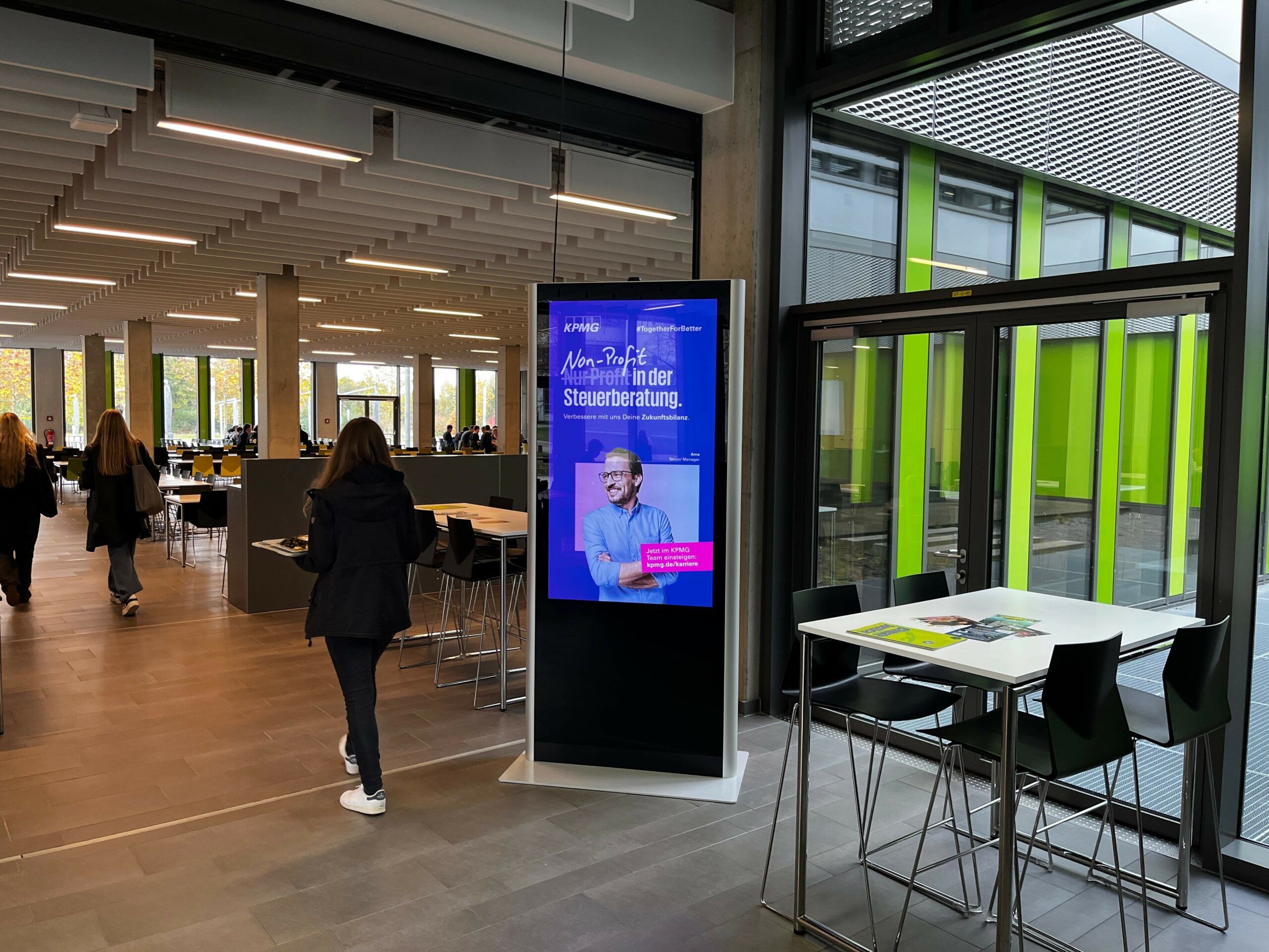 Unsere Screens stehen exklusiv auf dem Campus – in Mensen, Bibliotheken, Foyers oder zentralen Laufwegen. Also genau dort, wo Studierende regelmäßig Zeit verbringen. Im Gegensatz zu OOH-Flächen in Innenstädten erreichst Du Deine Zielgruppe hier in halböffentlichen Räumen mit weniger Ablenkung, höherer Aufenthaltsdauer und größerer Aufmerksamkeit.